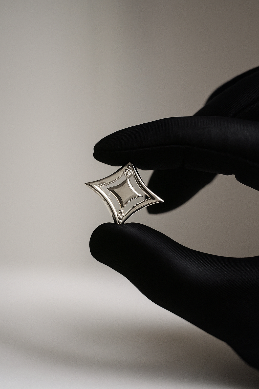 Crafted from high-quality zinc alloy, this tag features a unique geometric diamond-inspired shape with a reflective polished surface.